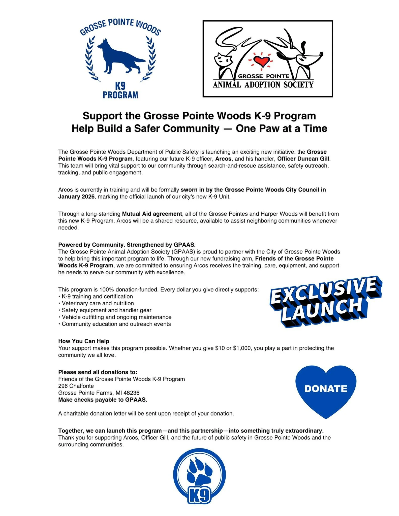 The need to raise funds for The Grosse Pointe Woods K-9 Program is continuous. While the Grosse Pointe Woods Police Department pays the K-9 officer’s salary, public safety departments are restricted from soliciting program funding. As a 501(c)3 non-profit organization, GPAAS serves as the program’s fundraising partner assisting with annual costs. Tax deductible donations can be made through GPAAS. All designated donations towards the Grosse Pointe Woods K-9 Program are allocated solely toward all training and certification costs, the specially equipped vehicle, and associated equipment necessary for the K-9 Team.